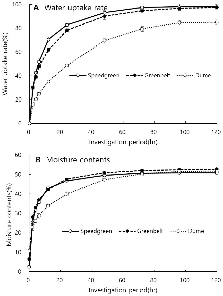 - This study was conducted to establish a standardized process for plug seedling production of Chinese chives for hydroponics. The research aimed to determine the germination characteristics and to investigate the effect of sowing amount and leaf cutting on growth during plug cultivation. The results showed that ‘Speedgreen’ had the highest germination rate, while the traditional variety ‘Dume’ exhibited a significantly lower germination rate. The germination rate of the ‘Speedgreen’ was 92% in 3 days, while the ‘Greenbelt’ reached 66% on the 3rd day and 83% on the 6th to 7th day, and then stopped increasing. The germination rate of ‘Dume’ was very low, less than 1% until the 7th day and about 24% on the 14th day. The mean germination time (MGT) was 2.28 to 1.38 days for the ‘Speedgreen’ and ‘Greenbelt’ as commercial varieties, but 9.22 days for the ‘Dume’. The coefficient of velocity of germination (CVG) and germination index (GI) were also the best for the ‘Speedgreen’. In the results of the water absorption characteristics of the seeds, the maximum water absorption rate of the ‘Dume’ was about 85%, while the ‘Speedgreen’ and ‘Greenbelt’ reached 97%. In a study on increasing the number of tillers, the increase in the number of leaves was not proportional increment to the seeding amount, and the increase in the number of leaves due to cutting treatment tended to increase as the cutting height increased. It would be good to sow about 8 to 10 seeds per cell in the plug tray. In particular, stem cutting as a treatment to induce increased tillering was deemed effective when performed at a point at least 5 cm above the subterranean part of the chive and that treatment will increasing fresh weight.