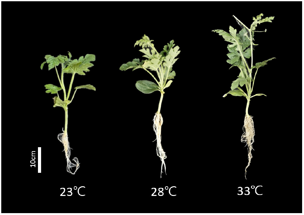 - This study aimed to determine the optimal air temperature for producing high-quality grafted watermelon (Citrullus lanatus) seedlings in a plant factory–based seedling production system. Grafted seedlings, with ‘DongjangGun’ as the rootstock and ‘SantaKkul’ as the scion, were cultivated for 21 days under three daytime air temperature treatments of 23°C, 28°C, and 33°C with a constant nighttime temperature of 18°C. Growth traits including plant height, root length, leaf number, leaf area, stem diameter, and biomass, as well as seedling quality indices such as top-to-root ratio, compactness, and crop growth rate (CGR), were evaluated at 7, 14, and 21 days after grafting. Seedling growth responses were strongly influenced by temperature. Higher temperatures promoted stem elongation, with seedlings at 33°C showing the tallest height but also exhibiting excessive elongation and reduced stem thickening, which are indicative of lower seedling quality. In contrast, seedlings grown at 28°C exhibited greater leaf area, thicker stems, and a more balanced allocation of shoot and root biomass. Seedling quality indices also confirmed that compactness, T/R ratio, and CGR were most favorable under 28°C by 21 days. Collectively, these findings demonstrate that while both 28°C and 33°C promoted vigorous growth, only 28°C supported sturdy morphology and balanced biomass allocation. Therefore, 28°C can be considered the optimal daytime air temperature for grafted watermelon seedling production in plant factory systems, providing a basis for stable year-round seedling production and improved environmental control strategies.