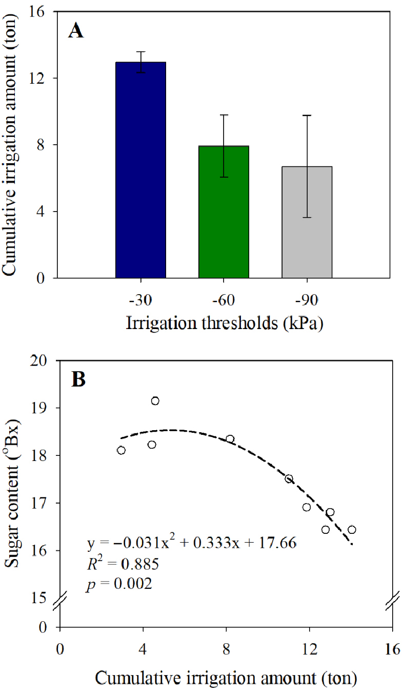 - Climate change has intensified abnormal weather patterns, leading to declines in grapevine cultivation and fruit quality. Consequently, effective water management is essential for producing high-quality grapes. This study aimed to determine the optimal irrigation threshold, based on soil moisture tension, for field-grown ‘Shine Muscat’ grapevines. Using an automated irrigation system controlled by tensiometers, grapevine growth and fruit quality were compared under three irrigation thresholds (-30, -60, and -90 kPa). The experiment was conducted in a vineyard under soil-based cultivation in Okcheon, Chungcheongbuk-do, Korea. The -30 kPa treatment resulted in the greatest leaf growth, photosynthetic activity, and cluster weight, whereas the -90 kPa treatment significantly reduced these parameters. In contrast, the -60 kPa treatment used approximately 39% less water than the -30 kPa treatment, while maintaining comparable growth and fruit quality. Moreover, it showed a trend toward higher sugar content in the fruit. Sugar content was inversely related to the cumulative irrigation amount, highlighting the importance of efficient irrigation management in achieving high-quality grape production. These findings demonstrate that a tensiometer-based automated irrigation system can be effectively applied in grapevine orchards, and the -60 kPa treatment enables the production of high-quality grapes, while reducing water usage and sustaining vine growth and fruit quality.