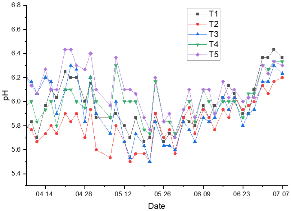 - This study evaluated the effects of biochar-based mixed substrates on the growth, yield, and fruit quality of cherry tomato (Solanum lycopersicum) and evaluated their potential as an alternative to conventional coir substrates. Five treatments were established: coir dust (T1, control) and four biochar-based mixtures with varying ratios of biochar, peatmoss, and perlite (T2: 3:7:0, T3: 3:0:7, T4: 1:1:1, T5: 2:1:1). Plant growth parameters (plant height, stem diameter, leaf length, leaf width, leaf number, and inflorescence number), substrate physicochemical properties, drainage pH and EC, yield, and fruit quality were measured. Coir (T1) exhibited greater water retention, while the mixed substrates had higher porosity and lower bulk density, enhancing aeration. Heavy metal concentrations in all substrates were below fertilizer regulation thresholds, ensuring safety. Drainage EC gradually increased during the late growth stage across all treatments, likely due to salt accumulation, but remained within acceptable limits. All biochar-based substrates produced equal or higher total and marketable yields compared to coir dust, while fruit quality did not differ significantly among treatments. There result demonstrate that biochar, peatmoss, perlite mixtures are feasible substitute for replacing imported coir offering a sustainable cultivation model that promote resource recycling and low-carbon horticulture.