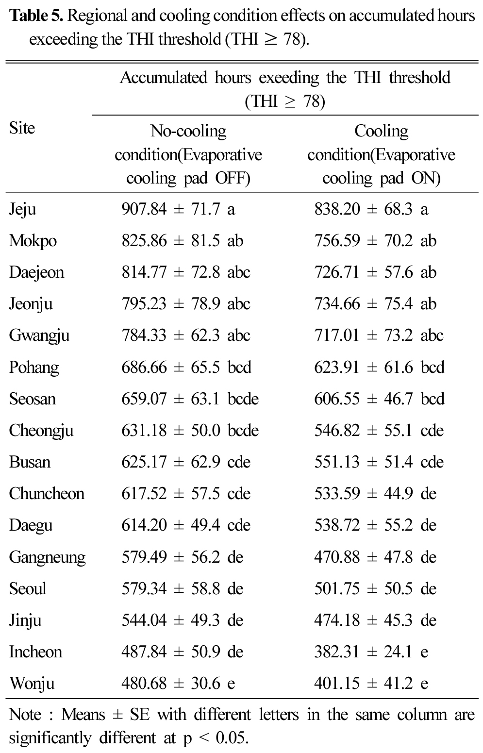 - This study evaluated the effectiveness of evaporative cooling pads in mitigating heat stress in mechanically ventilated broiler houses using a Building Energy Simulation (BES) approach. The developed BES model was validated with field data collected from a mechanical-ventilated broiler house in Jeongeup, South Korea. Validation results satisfied established criteria, with air temperature showing CvRMSE of 2.93-3.69% and MAPE of 2.20-3.17%, while THI showed RMSE of 1.308-2.157 and MAPE below 2.1%. Subsequently, 3,072 simulation cases were conducted by combining factors of regional location, building length, wall and roof thermal transmittance, broiler body weight, cooling pad operation (ON/OFF), and weather scenarios, under summer ventilation rates applied dynamically on an hourly basis. Analysis of variance indicated that regional location and cooling pad operation significantly affected heat stress, whereas building size, insulation level, and broiler weight showed no significant differences. The accumulated duration above the THI threshold of 78 decreased across all regions when cooling pads were operated. Post-hoc tests revealed that Jeju consistently formed the high-risk group, while Wonju (no cooling) and Incheon (with cooling) were classified as low-risk regions. In contrast, the annual maximum THI decreased only slightly (typically <1) under cooling conditions, suggesting limited mitigation of extreme peaks.