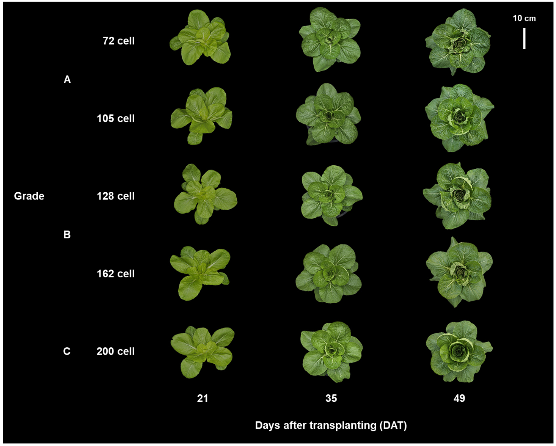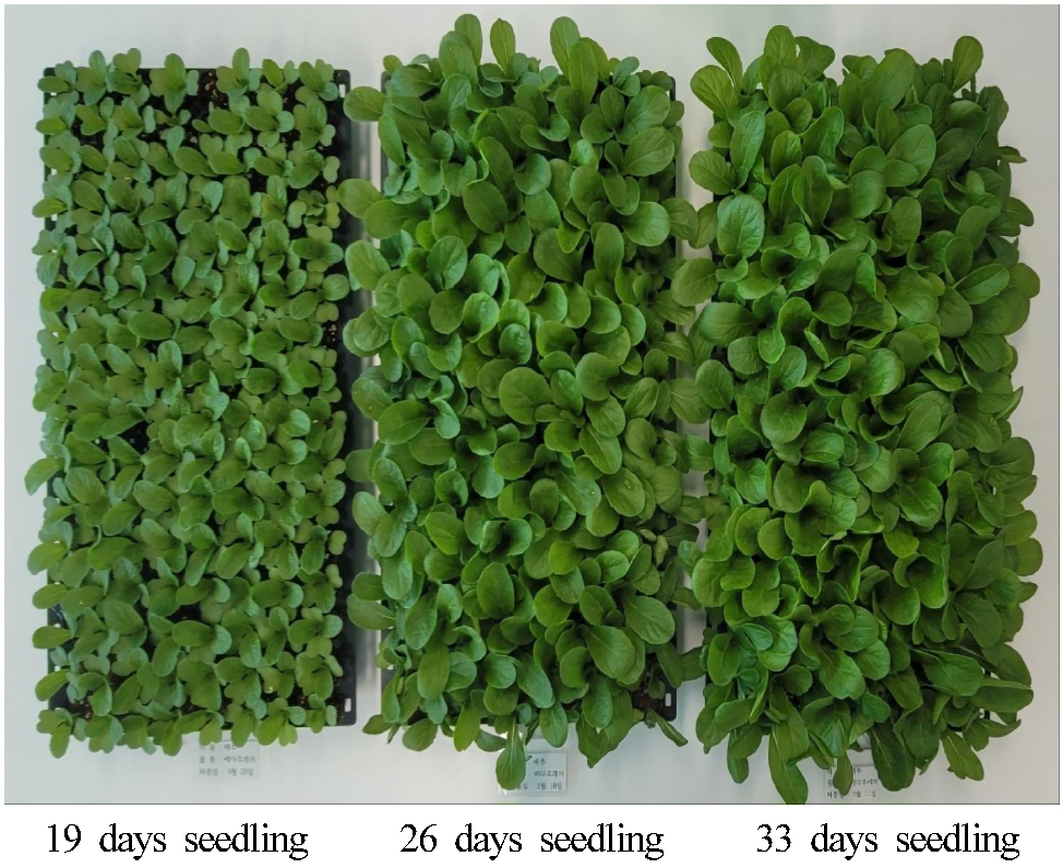 - Kimchi cabbage (Brassica rapa L. ssp. pekinensis) is the most widely consumed vegetable crop in Korea. The production of vigorous seedlings is essential in vegetable cultivation to ensure stable post-transplant growth, highlighting the need for technologies that enable rapid, objective, and non-destructive assessment. This study aimed to evaluate seedling growth of kimchi cabbage using image analysis and to determine differences in early growth after transplanting among image-based seedling grades. To induce variation in seedling growth, kimchi cabbage (cv. ‘Cheongmyeonggaeul’) seedlings were cultivated in plug trays with 72, 105, 128, 162, and 200 cells for 25 days after sowing, and then transplanted into pots. Before transplanting, images were acquired to calculate projected canopy size (PCS). PCS values allowed highly accurate prediction of leaf area and shoot fresh weight, and seedlings were subsequently classified into three grades (A-C). At 49 days after transplanting, growth responses differed by seedling grade: grade C seedlings exhibited delayed growth, whereas grades A and B showed comparable growth. These results suggest that PCS enables non-destructive estimation of seedling growth and that image analysis can be applied to select high-quality kimchi cabbage seedlings for transplanting.