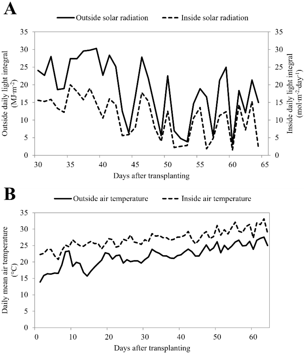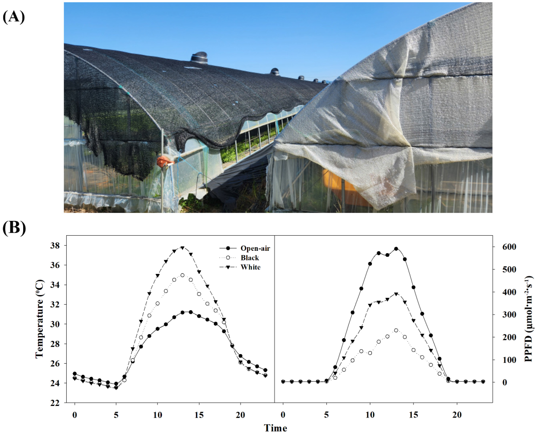 - This study investigated the effects of shading materials on the production of high-quality strawberry (Fragaria × ananassa Duch. cv. ‘Sulhyang’) plantlets and flower bud differentiation during the high-temperature summer season in a South Korean greenhouse. Black and white shading films were applied over 4 months, and the internal light environment, temperature, growth, and flowering characteristics were compared. The black shading film reduced greenhouse temperatures more effectively, but the white shading film increased photosynthetic photon flux density (PPFD) by 91% and altered the light spectrum, reducing blue wavelengths and enhancing red wavelengths. Compared to the black shading film, the white shading film produced shorter plants but higher fresh and dry weights of root parts, 13% larger crown diameters, and a 47% higher flower bud differentiation rate. These results indicate that white shading nets improve the light environment, promoting high-quality nursery production and early flowering. This approach could enhance commercial strawberry production by enabling earlier harvests and increasing farmer profitability.